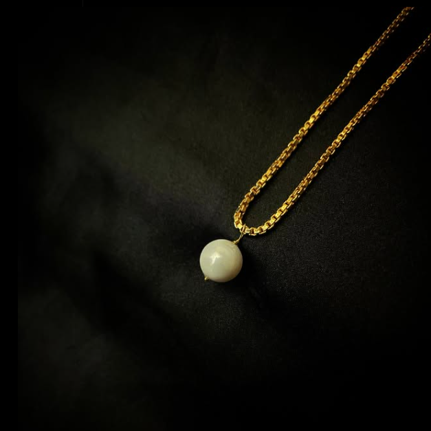 A solitary luminous synthetic pearl suspended from a sleek gold-tone chain. Minimal, elegant, and forever in style.