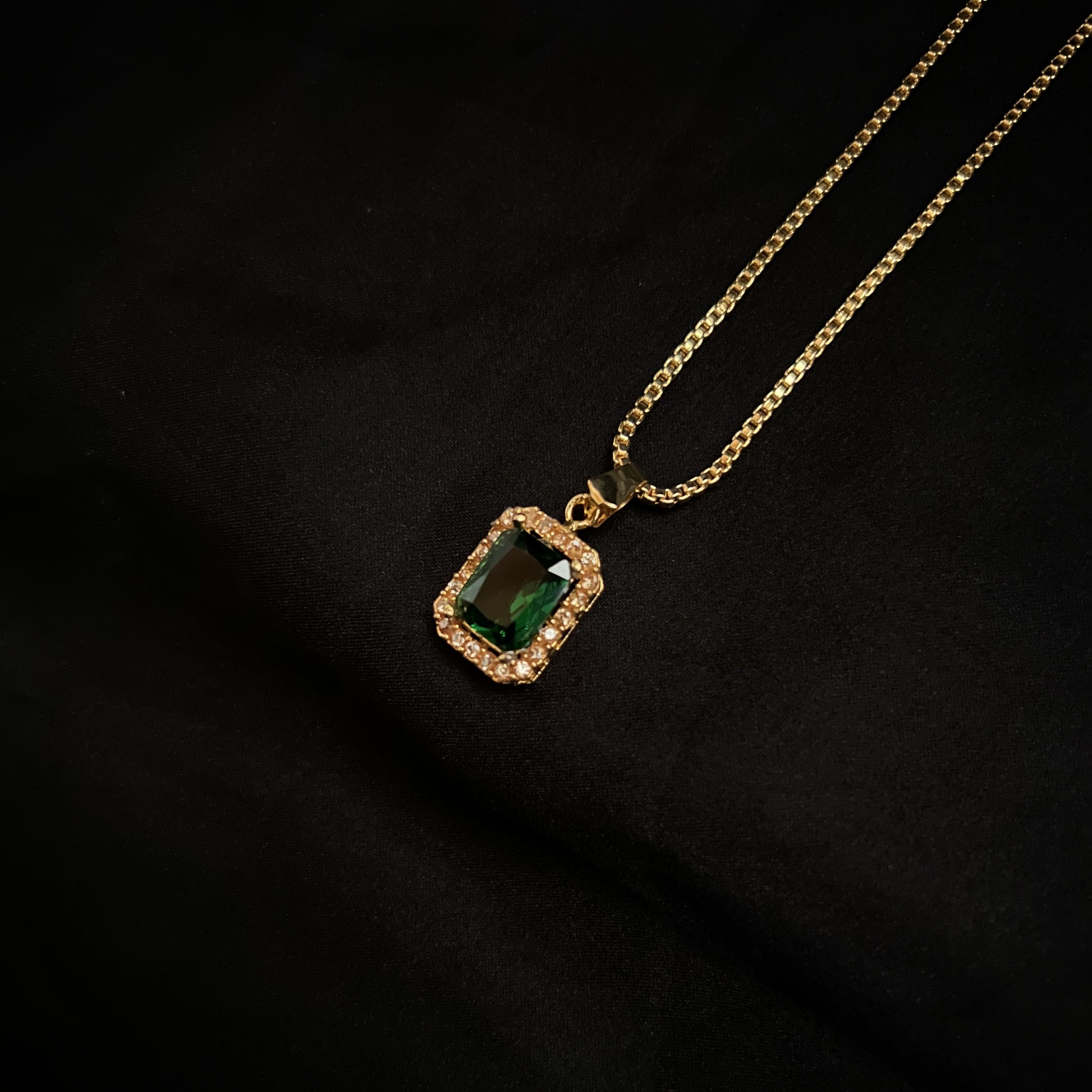 An emerald-cut green zircon glows at the center, encircled by a halo of sparkling stones and suspended from a rich gold-tone chain. Poised, regal, unforgettable.